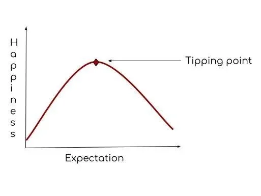 Perfectionism is in part fueled by expectation. Of itself expectation is not a problem. The authors of the Decision Book point out that without expectation we would be indifferent to the world and, as such, would struggle to be happy in the first place. It is our anticipation and expectations which are the fuel for happiness. However there is a tipping point where eventually reality meets our expectations and beyond which disappointment increases as happiness decreases.