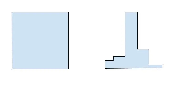 At first glance, it is tempting to say that the square on the left has the largest border, because it looks bigger compared to the ‘skyline’ shape on the right. But, of course, both shapes have the same border length, it is only the area that is larger on the left. If you fell for the trick, it was probably because your System 1 brain made a snap judgement. To see why they have the same border length we have to engage our System 2 brain more, for example to trace around the edge of the shape on the right, or see that the length plus height times two is the same for both.