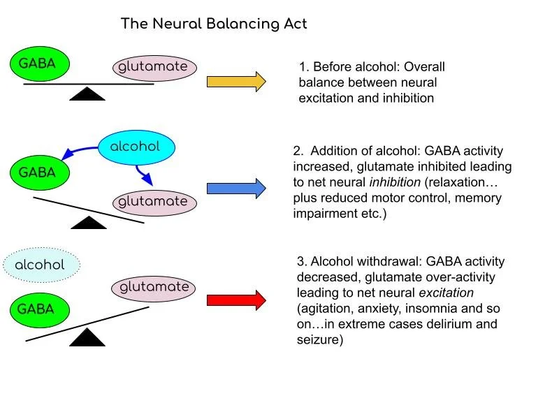 However, a common feature of human biology is that what goes up must come down and vice versa. With repeat exposure the body down-regulates GABA-a receptors, making them sparser on the cell surface, and up-regulates NMDA receptors. In the absence of alcohol, say the following day after a night out, or if a chronic drinker decides to stop suddenly, this essentially results in too little GABA and too much glutamate activity, leading to overall neural excitation. Glutamate is important in thinking, memory and learning, but too much of it, and too little GABA, leads to the agitation and anxiety of alcohol withdrawal, and can even lead to delirium tremens, seizure and worse. Alcohol also depletes vitamin B stores, in particular B1, aka thiamine, and this in turn can result in a condition called Wernicke's encephalopathy, characterised by confusion, imbalance, memory-loss and potential brain damage (Korsakoff's syndrome). It is for this reason that heavy drinkers should never go cold-turkey, no matter how well-intentioned, and ought to take regular B-vitamins.